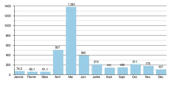 Le débit moyen mensuel observé en mars (minimum d'étiage) est de 61,1 m3/s, soit à peine 4,5 % du débit moyen du mois de mai (1 381 m3/s), ce qui souligne la très forte amplitude des variations saisonnières. Sur la durée d'observation de 53 ans, le débit mensuel minimal a été de 30,0 m3/s (en ), tandis que le débit mensuel maximal s'élevait à 2 720 m3/s ().