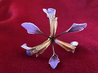 Les fleurs, produites par les touffes ayant suffisamment d'ombre, sont portées par une hampe garnie de bractées ressemblant à des feuilles. La fleur est formée de 3 grands tépales externes étalés, 3 tépales internes relevés, violet bleuâtre, veinés de sombre, à base rétrécie jaune foncé. La floraison s'étale de mai à juillet.