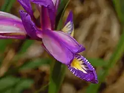 La fleur est composée de trois grands sépales pétaloïdes (pétales extérieurs), et de trois pétales plus petits[13]. Les sépales mesure de 3 à 5 cm de long[23]. Leur centre porte une zone centrale jaune pâle[9],[24], ou blanche[21], veinée de violet[13],[19], de pourpre[25] ou de bleu[7],[16]. Certaines références décrivent plutôt une zone violet foncé à veines blanches[22]. Les pétales dressés sont bleu violet[19], pourpre[7],[26] ou rouge violacé[27]. Ils mesurent 2 à 5 cm de long[23], et la base est teintée de vert ou de brun[23].
