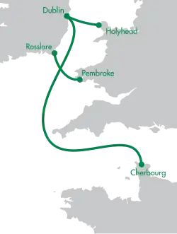 Les ports d'attaches sont Dublin, Rosslare (Irlande), Holyhead, Pembroke (Royaume-Uni) et Cherbourg (France).