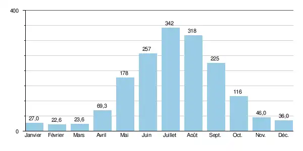 La période des hautes eaux va de mai à septembre inclus, avec un sommet en juillet. Les basses eaux se déroulent de novembre à avril, ce qui correspond aux très importantes gelées qui affectent toute la région, et surtout les zones de sommets montagneux. Le débit moyen mensuel observé en février (minimum d'étiage) atteint 22,6 m3/s, soit moins de 5 % du débit moyen du mois de juillet (maximum de l'année avec 342 m3/s), ce qui montre l'importance des variations saisonnières. Sur la période d'observation de 61 ans, le débit mensuel minimal a été de 12,2 m3/s en , tandis que le débit mensuel maximal s'est élevé à 810 m3/s en .