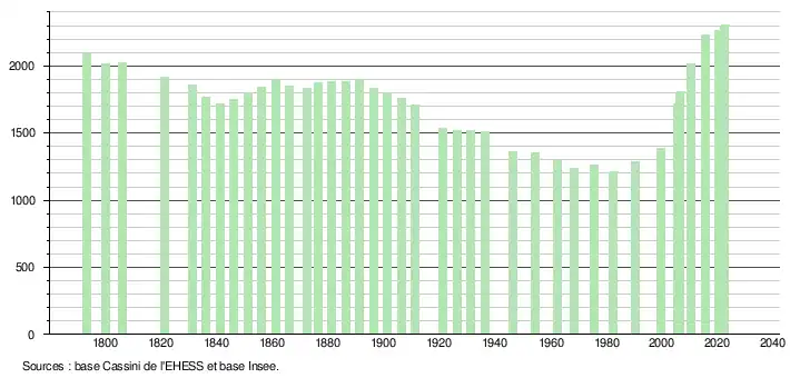 L'évolution du nombre d'habitants est connue à travers les recensements de la population effectués dans la commune depuis 1793. Pour les communes de moins de 10 000 habitants, une enquête de recensement portant sur toute la population est réalisée tous les cinq ans, les populations de référence des années intermédiaires étant quant à elles estimées par interpolation ou extrapolation[24]. Pour la commune, le premier recensement exhaustif entrant dans le cadre du nouveau dispositif a été réalisé en 2005[25].