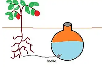 En outre, les racines se développant en direction de l'humidité, elles se dirigent vers l'olla et au bout de quelque temps, les parois de la jarre se retrouvent recouvertes de racines venant puiser l'eau directement à la source (en particulier pour les plantes au système racinaire important comme les tomates)[56]. Ainsi, une jarre ne se comporte pas de la même façon à l'atmosphère et une fois enterrée, elle s'adapte aux conditions de son milieu.