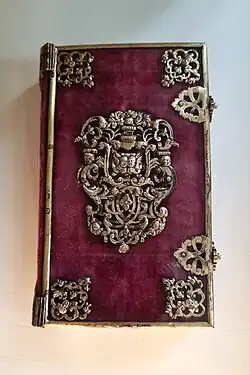 Le musée des Arts décoratifs de Strasbourg détient une reliure d'orfèvrerie de velours de soie cramoisi avec encadrements d’argent doré pour les plats[3], réalisée vers 1774-1777 pour un livre de cantiques imprimé par Jonas Lorenz, imprimeur-libraire à Strasbourg.