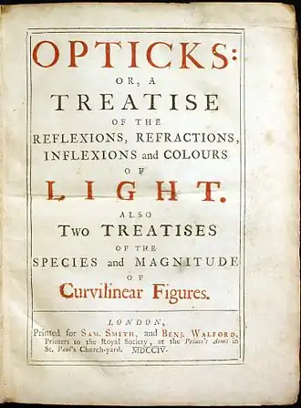 En 1704, il fait publier son traité Opticks[24] dans lequel figurent sa théorie corpusculaire de la lumière, l’étude de la réfraction, la diffraction de la lumière et sa théorie des couleurs. Il y démontre que la lumière blanche est formée de plusieurs couleurs et déclare qu'elle est composée de particules ou de corpuscules. De plus, il ajoute que lorsqu'elle traverse un milieu plus dense, elle est réfractée par son accélération. À un autre endroit de son traité, il explique la diffraction de la lumière en l'associant à une onde.