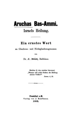 - ↑ Titre en yiddish: Aruchas Bas-Ammi; en hébreu: Aruhat Bat-Ami (La guérison de la fille de mon peuple); sous-titre: Israels Heilung: ein ernstes Wort an Glaubens und Nichtglaubensgenossen (La guérison d'Israël: un mot grave à nos coreligionnaires et non-coreligionnaires)