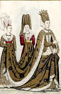 Aux accusations de sorcellerie et d'adultère proférées contre Isabeau de Bavière s'ajoute celle de se livrer à une mode extravagante et coûteuse : la reine porte des robes pleines de bijoux et des coiffures tressées élaborées, enroulées en de hautes coquilles couvertes de larges hennins doubles qui, selon les chroniqueurs contemporains, nécessitent des portes élargies pour pouvoir circuler[101]. L'écrivain Brantôme remarque dans les écrits qu'il rédige à propos de Marguerite de Valois, la première épouse d'Henri IV, à la fin du XVIe siècle : « On donne le loz à la reyne Isabelle de Bavière d'avoir apporté en France les pompes et les gorgiasetez pour bien habiller superbement et gorgiasement les dames ». En 1406, un pamphlet satirique pro-bourguignon en vers allégoriques accuse Isabeau de Bavière d'entraîner le royaume dans une guerre civile[59] en raison de son indolence et la décrit comme une Allemande « à la tête vide », lui reprochant en outre qu'elle « ne prenait plaisir à une nouvelle grossesse que dans la mesure où on lui offrait de nouveaux cadeaux »[99].