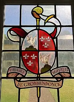 Sur ce vitrail, il y a quelques erreurs d'émaux : les corbeaux essorant, posé sur un monticule de 3 coupeaux de sinople, devraient être de sable.