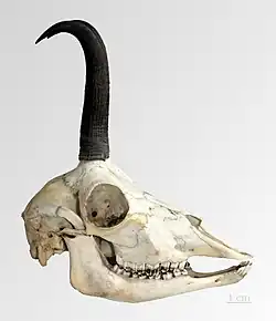 Les cornes sont présentes pour les deux sexes. Chez le mâle, les étuis sont épais, de section ovale, avec le grand axe dans le sens antéro-postérieur ; le crochet est fortement arqué ; la pinte prend une direction parallèle à l’axe de la corne. Chez la femelle, les étuis sont plus grêles et moins recourbés que ceux du mâle et ont une section arrondie ; le crochet est plus ouvert. Les cornes ont pour origine une production cutanée creuse et permanente. Elles se développent à partir de 3 à 4 mois sous la forme d’un petit corné de kératine. La croissance est importante les trois premières années, surtout au cours de la deuxième, lorsque le crochet se forme. L'examen des cornes, dans le cas d'animaux morts ou capturés, permet de déterminer l'âge par dénombrement des segments de croissance. Leur croissance est permanente avec un arrêt en hiver ce qui détermine sur l’étui un sillon circulaire.
