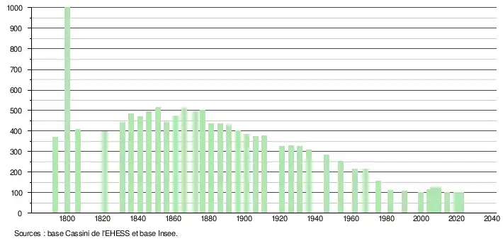 L'évolution du nombre d'habitants est connue à travers les recensements de la population effectués dans la commune depuis 1793. Pour les communes de moins de 10 000 habitants, une enquête de recensement portant sur toute la population est réalisée tous les cinq ans, les populations de référence des années intermédiaires étant quant à elles estimées par interpolation ou extrapolation[13]. Pour la commune, le premier recensement exhaustif entrant dans le cadre du nouveau dispositif a été réalisé en 2004[14].
