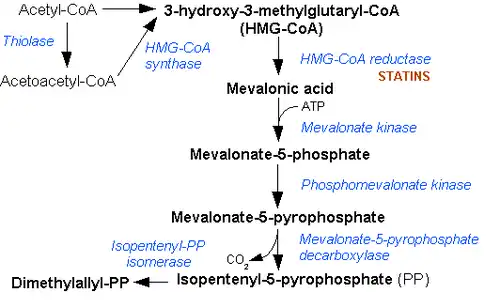 - ↑ calque de l'anglais Isopentenyl pyrophosphate, en terminologie française de chimie, pyrophosphate d'isopentényle.
