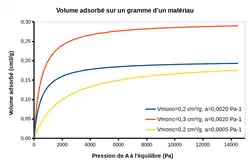 Pour les hautes pressions, on tend vers la valeur maximale possible . Cette asymptote correspond à une monocouche de molécules adsorbées sur la surface.