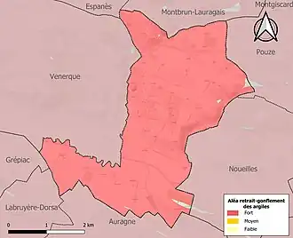 Le retrait-gonflement des sols argileux est susceptible d'engendrer des dommages importants aux bâtiments en cas d’alternance de périodes de sécheresse et de pluie. 99,4 % de la superficie communale est en aléa moyen ou fort (88,8 % au niveau départemental et 48,5 % au niveau national). Sur les 225 bâtiments dénombrés sur la commune en 2019, 225 sont en aléa moyen ou fort, soit 100 %, à comparer aux 98 % au niveau départemental et 54 % au niveau national. Une cartographie de l'exposition du territoire national au retrait gonflement des sols argileux est disponible sur le site du BRGM[24],[Carte 3].