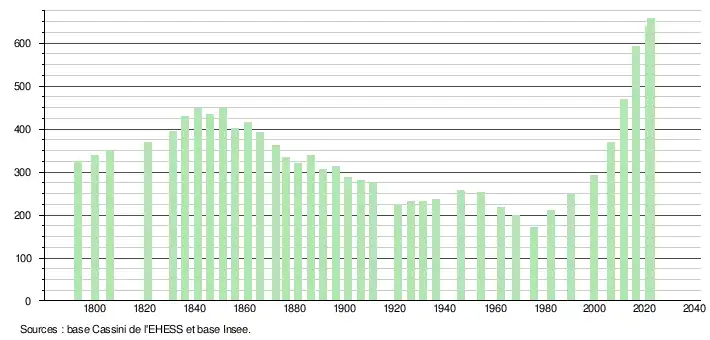 - ↑ Population municipale de référence en vigueur au 1er janvier 2025, millésimée 2022, définie dans les limites territoriales en vigueur au 1er janvier 2024, date de référence statistique : 1er janvier 2022.