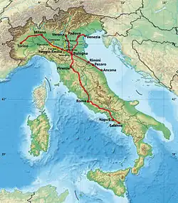 - Venise Santa Lucia - Venise Mestre - Padoue Centrale - Bologne Centrale - Florence Santa Maria Novella - Rome Tiburtina - Rome Termini- Naples Centrale - Salerno