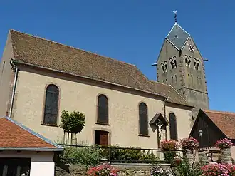 En 1919, la partie supérieure fut reconstruite et surélevée dans le style néo-roman. Le clocher roman sur trois niveaux inférieurs fut surmonté par deux étages néo-romans. Le toit en bâtière fut remplacé par un toit rhomboïdal d'inspiration allemande. Le chœur primitif situé sur la tour s'inséra entre la nef et la tour. La sacristie, accolée au mur oriental, est plus récente. À l'intérieur de la tour, une peinture murale du XIVe siècle représente le Jugement dernier. Sur la tour, à l'extérieur on aperçoit, des sculptures de la deuxième moitié du XIIe siècle, et à l'intérieur de ce qui fait office de chœur, on peut admirer en outre une peinture murale du XIVe siècle. La tour, y compris la peinture, est inscrite depuis le à l'inventaire des Monuments historiques. Le bâtiment appartient à la commune et des travaux de restauration du clocher sont actuellement à l'étude avec le concours des Monuments historiques pour éliminer les traces de salissures sur les enduits, provenant d'une prolifération cryptogamique. Au niveau supérieur se trouvent les trois cloches du beffroi, coulées après la Première Guerre mondiale. Le décor est richement affirmé. On y constate vingt cinq figures de saints et de saintes.
