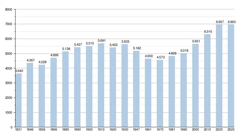 Les chiffres des années 1831 à 1970 tiennent compte des chiffres des anciennes communes fusionnées.