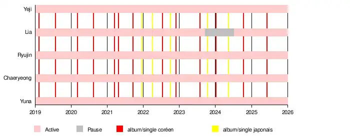 | Yeji | 예지 | Hwang Ye-ji | 황 예지 | Leader, danseuse principale, chanteuse secondaire, rappeuse, unnie (la plus âgée) | ||