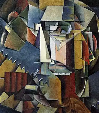 Dans l'« Autoportrait à la scie » apparaît un éclatement de la figure cubo-futuriste analytique. Le monde des humains et le monde des objets sont confondus où l'on reconnaît là des dents, là un nez. Pourtant l'intégralité du visage est saisie par l’œil du spectateur qui se retrouve dans le chaos[3]. Le dynamisme du portrait est créé par une série de petits triangles dans diverses positions d'où émerge la figure centrale.