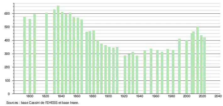 L'évolution du nombre d'habitants est connue à travers les recensements de la population effectués dans la commune depuis 1793. Pour les communes de moins de 10 000 habitants, une enquête de recensement portant sur toute la population est réalisée tous les cinq ans, les populations de référence des années intermédiaires étant quant à elles estimées par interpolation ou extrapolation[21]. Pour la commune, le premier recensement exhaustif entrant dans le cadre du nouveau dispositif a été réalisé en 2008[22].