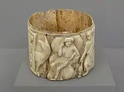 Les pyxides d'ivoire sont détournées à des fins religieuses et servent désormais à contenir l'hostie ou d'autres accessoires de la liturgie. Ces boîtes s'ornent de scènes chrétiennes de la vie du Christ par exemple sur les pyxides à scènes néo-testamentaires de l'orient byzantin où l'iconographie est conforme aux modèles des peintures paléochrétiennes des catacombes romaines[14]. Ceci montre que l'empire byzantin est désormais le "dépositaire officiel" de la tradition antique et dispose d'un répertoire iconographique déjà en partie constitué par de nombreuses importations d'objets. Les légendes mythologiques et "païennes" sont peu à peu reléguées au rôle d'ornementation élégante, vidée de sa signification. Les ivoires deviennent alors un véhicule des nouvelles formules stylistiques.