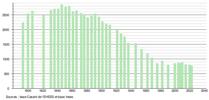 L'évolution du nombre d'habitants est connue à travers les recensements de la population effectués dans la commune depuis 1793. Pour les communes de moins de 10 000 habitants, une enquête de recensement portant sur toute la population est réalisée tous les cinq ans, les populations de référence des années intermédiaires étant quant à elles estimées par interpolation ou extrapolation[19]. Pour la commune, le premier recensement exhaustif entrant dans le cadre du nouveau dispositif a été réalisé en 2004[20].
