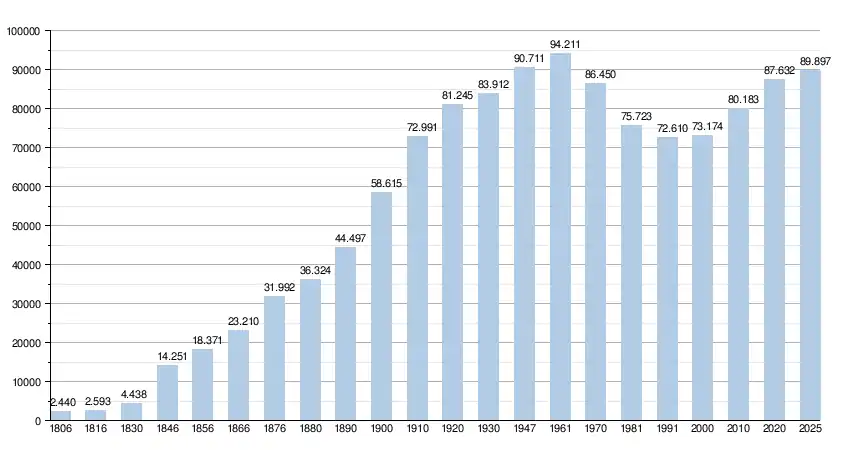 | Habitants | 4 438 | 14 251 | 18 371 | 23 210 | 31 992 | 36 324 | 44 497 | 58 615 | 72 991 | 81 245 | 83 912 | 90 711 | 94 211 | 86 450 | |||||||||||||||