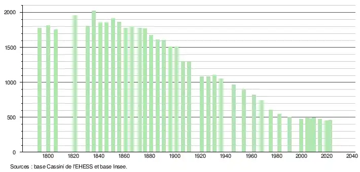 L'évolution du nombre d'habitants est connue à travers les recensements de la population effectués dans la commune depuis 1793. Pour les communes de moins de 10 000 habitants, une enquête de recensement portant sur toute la population est réalisée tous les cinq ans, les populations de référence des années intermédiaires étant quant à elles estimées par interpolation ou extrapolation[23]. Pour la commune, le premier recensement exhaustif entrant dans le cadre du nouveau dispositif a été réalisé en 2004[24].