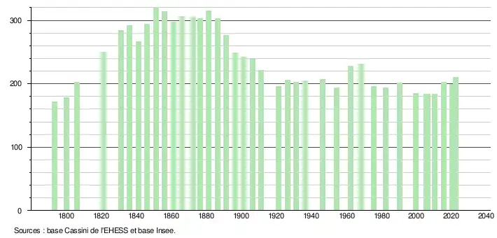 - ↑ Fiches Insee - Populations de référence de la commune pour les années 2006, 2007, 2008, 2009, 2010, 2011, 2012, 2013, 2014, 2015, 2016, 2017, 2018, 2019, 2020, 2021 et 2022.