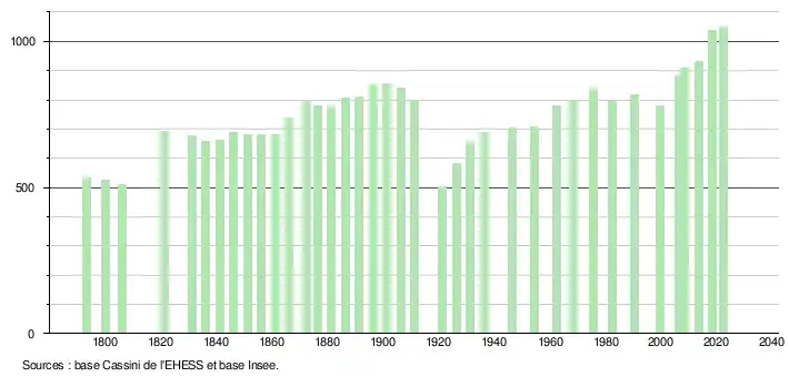L'évolution du nombre d'habitants est connue à travers les recensements de la population effectués dans la commune depuis 1793. Pour les communes de moins de 10 000 habitants, une enquête de recensement portant sur toute la population est réalisée tous les cinq ans, les populations de référence des années intermédiaires étant quant à elles estimées par interpolation ou extrapolation[28]. Pour la commune, le premier recensement exhaustif entrant dans le cadre du nouveau dispositif a été réalisé en 2008[29].