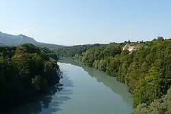 - L'ancien pont suspendu sur l'Isère datant de 1857 a été remplacé par un nouveau pont en 2013[22].
