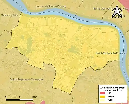 Le retrait-gonflement des sols argileux est susceptible d'engendrer des dommages importants aux bâtiments en cas d’alternance de périodes de sécheresse et de pluie. 93,9 % de la superficie communale est en aléa moyen ou fort (67,4 % au niveau départemental et 48,5 % au niveau national). Sur les 2 214 bâtiments dénombrés sur la commune en 2019, 2 214 sont en aléa moyen ou fort, soit 100 %, à comparer aux 84 % au niveau départemental et 54 % au niveau national. Une cartographie de l'exposition du territoire national au retrait gonflement des sols argileux est disponible sur le site du BRGM[37],[Carte 2].