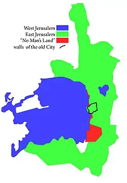 Jérusalem-Ouest est la partie de la ville de Jérusalem qui se situe dans le territoire israélien à l'issue des accords d'armistice du 3 avril 1949 conclus entre l'État d'Israël, créé le 14 mai 1948 à Tel-Aviv à la suite de la déclaration d'indépendance lue par David Ben Gourion, président alors du conseil représentatif juif (Yishouv) et le royaume hachémite de Transjordanie, alors dirigé par le roi Abdallah 1er, qui s'était fait proclamer « roi de Palestine » le à Jéricho. L'État juif y a établi notamment ses ministères, la Présidence de l'État, la Cour suprême, le Musée national appelé Musée d'Israël (créé à compter de 1965), son Assemblée nationale -la Knesset-, la direction générale de la police, le grand centre hospitalier « Hadassah » (comprenant notamment sa synagogue décorée par Marc Chagall), le site aussi du Yad Vashem (mémoire de l'Holocauste des juifs lors de la 2ème guerre mondiale), les sièges des fédérations de kibboutz et de moshav. Il en a fait " de facto " la capitale de l'État d'Israël par une déclaration unilatérale du gouvernement israélien dès le [1] et un tel fait avait déjà été affirmé devant la Knesset par David Ben Gourion le 9 et le 13 décembre 1949 : aucun député n'avait alors protesté contre de telles déclarations. La quasi-totalité de la communauté internationale ne reconnaît pas cette décision particulière car Jérusalem et Bethléem devaient être un corpus separatum selon le plan de partage de la Palestine voté le 29 novembre 1947 par les membres de l'ONU. La quasi-totalité des ambassades en Israël seront établies à Tel Aviv à compter de 1949.