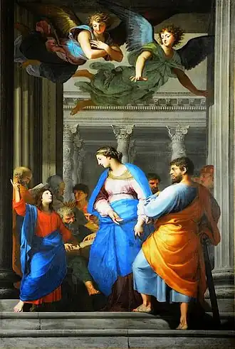 ↑ Romanisation de la figure de Jésus vêtu de la toge parée d'un double galon vertical. «Sa figure est mise en valeur par sa position centrale, par son geste du bras droit et par le drap d'honneur tenu dans son dos par deux personnages. Mais les disciples sont habillés exactement comme lui». Cf. François Bœspflug, «Le Christ vêtu par les artistes», Lumière & vie, no292, , p.55 (lire en ligne).