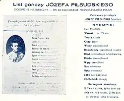Reproduction de 1928 d'un avis de recherche de 1887 concernant J. Piłsudski, distribué (probablement par ses adversaires politiques) pour « le 10e anniversaire de l'indépendance polonaise » :