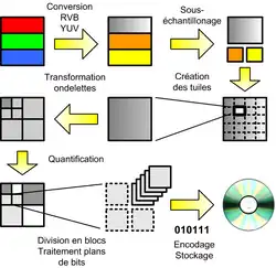 Le processus de codage suit un schéma classique de modification des propriétés statistiques des données source par un changement de modèle (synthèse) colorimétrique par une transformée, avant quantification des coefficients issus de cette transformée puis codage entropique. Les nouveautés par rapport à JPEG du point de vue compression sont l’utilisation d’une transformée en ondelettes, qui offre une scalabilité naturelle, mais surtout d’un algorithme de codage entropique très sophistiqué. Celui-ci est fortement basé sur l’algorithme EBCOT de David Taubman. Il consiste en un regroupement et une modélisation des coefficients ondelettes qui fournissent à un codeur arithmétique adaptatif un train binaire possédant les propriétés statistiques adéquates.