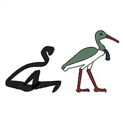 Il représente l'oiseau bȝ, originellement probablement un jabiru d'Afrique (Ephippiorhynchus senegalensis). La «goutte pectorale» particulièrement grande est peut être un souvenir des caroncules du jabiru mâle. Le jabiru ayant visiblement disparu d'Égypte au début de l'aire pharaonique[1]. Il ressemble donc dès l'Ancien Empire à une cigogne noire (Ciconia nigra) . Il est translittérébȝ.