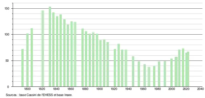 L'évolution du nombre d'habitants est connue à travers les recensements de la population effectués dans la commune depuis 1793. Pour les communes de moins de 10 000 habitants, une enquête de recensement portant sur toute la population est réalisée tous les cinq ans, les populations de référence des années intermédiaires étant quant à elles estimées par interpolation ou extrapolation[27]. Pour la commune, le premier recensement exhaustif entrant dans le cadre du nouveau dispositif a été réalisé en 2005[28].