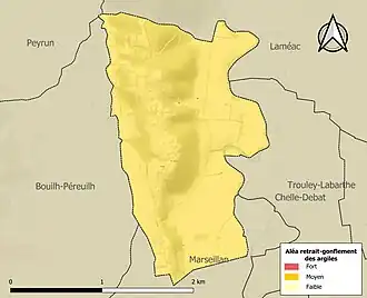 Le retrait-gonflement des sols argileux est susceptible d'engendrer des dommages importants aux bâtiments en cas d’alternance de périodes de sécheresse et de pluie. La totalité de la commune est en aléa moyen ou fort (44,5 % au niveau départemental et 48,5 % au niveau national). Sur les 36 bâtiments dénombrés sur la commune en 2019, 36 sont en aléa moyen ou fort, soit 100 %, à comparer aux 75 % au niveau départemental et 54 % au niveau national. Une cartographie de l'exposition du territoire national au retrait gonflement des sols argileux est disponible sur le site du BRGM[20],[Carte 3].