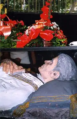 Parmi ceux qui sont venus prier au tombeau du père Laval à Sainte-Croix figure l'abbé Pierre, lors de sa visite dans l'île en 1994.