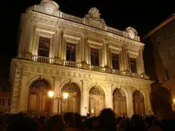 Soufflot est également intervenu dans la construction de deux autres bâtiments publics : la loge du change et le théâtre. Les opérations de change étaient opérées directement dans les rues du quartier Saint-Jean ou les maisons alentour. En 1653 avait été construite à cet usage une loge avec, en façade, un portique de quatre arcades et un étage bas. On ne s'en satisfit plus au XVIIIe siècle et Soufflot fut invité en 1747 à sa transformation. Le bâtiment fut agrandi par l’ajout d’une cinquième arcade de même style que les premières ; l’étage fut entièrement refait avec des colonnes ioniques engagées entre les fenêtres et aux angles. Il était surmonté d’un entablement dorique et de deux horloges de part et d’autre d’une attique encadrant en son milieu le blason du roi. Cette loge servit peu et, après avoir été convertie en salpêtrière pendant la Révolution, devait être reconvertie en temple en 1803[4]. L’espace entre l’Hôtel de ville et le Rhône était occupé par un jardin, d’ailleurs très fréquenté. Soufflot a été invité à y construire un Grand théâtre (1756) qui avait belle apparence mais les aménagements intérieurs n’ont pas donné satisfaction. C’est pourquoi, à la suite d'un incendie en 1826, il a été préféré de le détruire avant la reconstruction d’un nouvel Opéra à partir de 1828[4].