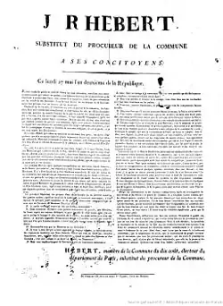 Fin juillet 1793, l’entrée de Robespierre au Comité de salut public marque un tournant, tandis que la répression des enragés commence avec l’arrestation de Jacques Roux. En août-septembre 1793, Hébert intensifie son action à travers Le Père Duchesne et ses interventions publiques. Le , aux Jacobins, il réclame une adresse exigeant l’intensification de la Terreur et la lutte contre les accapareurs, s’opposant à la prudence de Robespierre. Son influence s'accroît au sein du mouvement sans-culotte, et il parvient à mobiliser les sections parisiennes pour contraindre la Convention à adopter des mesures radicales, notamment en réclamant la convocation d'assemblées primaires législatives qui, de facto, entraînent la dissolution de cette instance. Hébert, ou plutôt Le Père Duchesne, qui se présente comme le seul héritier légitime de L'Ami du peuple après l'assassinat de Marat estime qu'après avoir imposé la volonté de la Commune à la Gironde, le moment est venu de la faire prévaloir sur la Montagne[75].