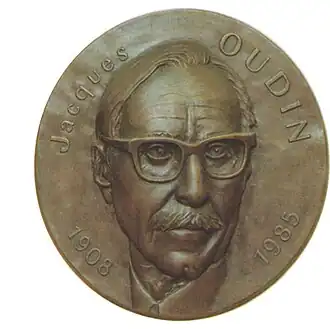 Médaillon représentant Jacques Oudin à l'Institut Pasteur - Correspondant étranger de l’Académie Royale de Médecine de Belgique – Associé étranger de l’Académie Nationale des Sciences USA (Washington) – Membre étranger de l’Académie Royale Suédoise des Sciences – Membre honoraire étranger de l’Académie Américaine des Arts et Sciences (Boston)