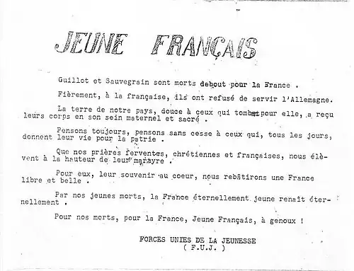 - Tract distribué à Toulouse par les Forces unies de la jeunesse à l'annonce de l'exécution de Jacques Sauvegrain et de son camarade Guyaux, qui avaient été tous deux élèves au lycée Pierre-de-Fermat de Toulouse