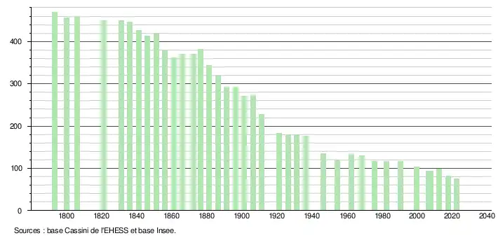 L'évolution du nombre d'habitants est connue à travers les recensements de la population effectués dans la commune depuis 1793. Pour les communes de moins de 10 000 habitants, une enquête de recensement portant sur toute la population est réalisée tous les cinq ans, les populations de référence des années intermédiaires étant quant à elles estimées par interpolation ou extrapolation[12]. Pour la commune, le premier recensement exhaustif entrant dans le cadre du nouveau dispositif a été réalisé en 2007[13].