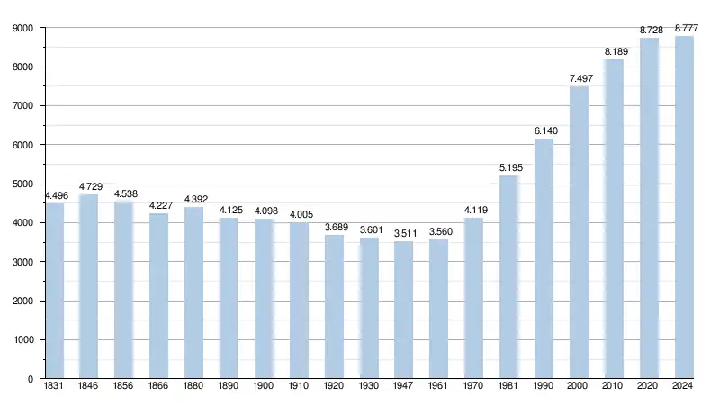 Les chiffres des années 1831 à 1970 tiennent compte des chiffres des anciennes communes fusionnées.