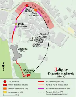 Malgré ses dimensions modestes, Jaligny porte le titre de ville depuis le Moyen Âge, qualité confirmée en 1569[2] et 1752[3] dans l'énumération des villes closes du Bourbonnais. Jadis close de murailles, son enceinte avait la forme d'une demi-circonférence. La domination des seigneurs de Bourbon ayant longtemps été limitée à la région proche de Moulins, la plus grande partie du territoire arrosé par la Besbre et ses affluents, et, plus à l'est, par la Lodde, se trouvait placée dans le ressort de la puissante seigneurie de Jaligny[4].