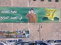 La propagande du régime libyen s'oriente avec les années vers la diffusion d'un culte de la personnalité, organisé autour de Mouammar Kadhafi et de sa pensée par les médias officiels, comme l'agence de presse Jamahiriya News Agency ou la télévision d'État Aljamahiriya TV. Kadhafi est présenté comme le héros de l'unité arabe et du tiers-monde face à l'hégémonie occidentale[68]. La troisième théorie universelle devient la doctrine officielle de la Jamahiriya ; Le Livre vert est imprimé à des millions d'exemplaires et diffusé dans de multiples langues pour diffuser l'idéologie jamahiriyenne ; des colloques sont organisés pour louer l'ouvrage et le « génie » de son auteur[69].