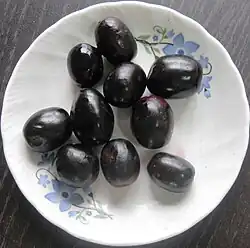 Les fruits se développent en mai ou juin et ressemblent à de grandes baies. Le fruit est oblong, ovoïde, vert au départ, il vire au rose, et enfin au noir et au pourpre brillant lors de sa maturation. Ces fruits sont pourpres et ovales comme des prunes[3].