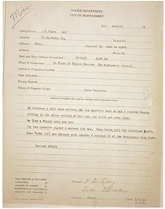Un jour de 1943, Rosa Parks, une couturière noire, entre dans le bus et paie son billet, puis elle va s'asseoir directement sur un siège se trouvant dans la zone pour les Noirs (au fond du bus). James Blake lui ordonne de respecter le règlement, qui l'oblige à sortir du bus pour ne pas déranger les Blancs assis à l'avant et de rentrer dans le bus par la porte arrière. Rosa Parks descend mais le bus démarre avant qu'elle ne puisse remonter[1].